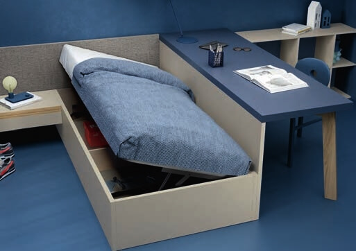 A área de dormir consiste numa prática cama elevável com grande capacidade interna e gavetas suspensas.