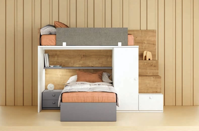 Quanto Juvenil com Beliche muito completo, pensado para pequenos espaços. Composição de Beliche em tons Branco e Cinzento com têxtil.