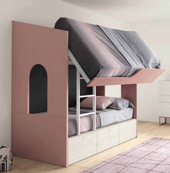 Quarto juvenil que combina um Beliche original em Branco e Cor de Rosa com uma cômoda com sapateira.