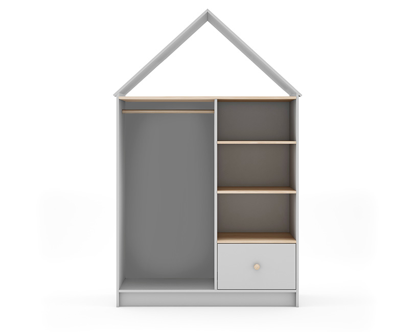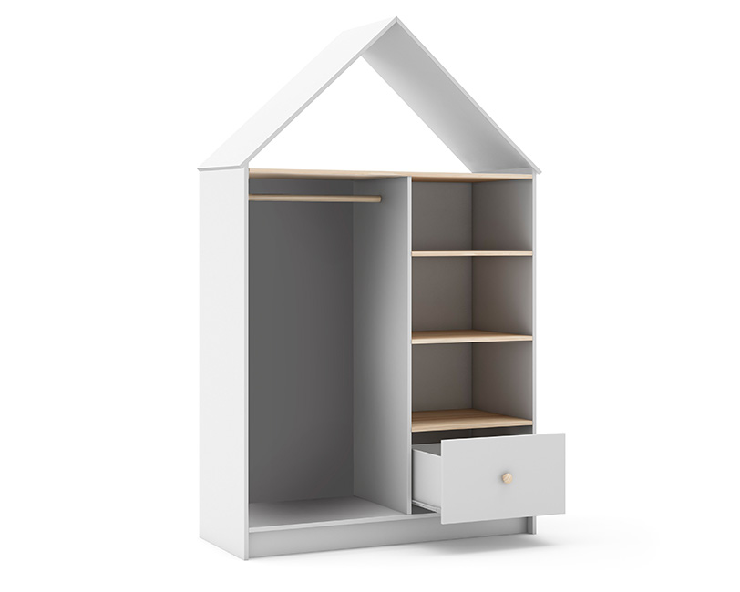 • Estrutura em formato de casa • Cor branca • Uma gaveta espaçosa • Varão para pendurar roupas • Prateleiras abertas para organização • Fácil montagem • Design versátil para diferentes idades • Puxador em madeira natural