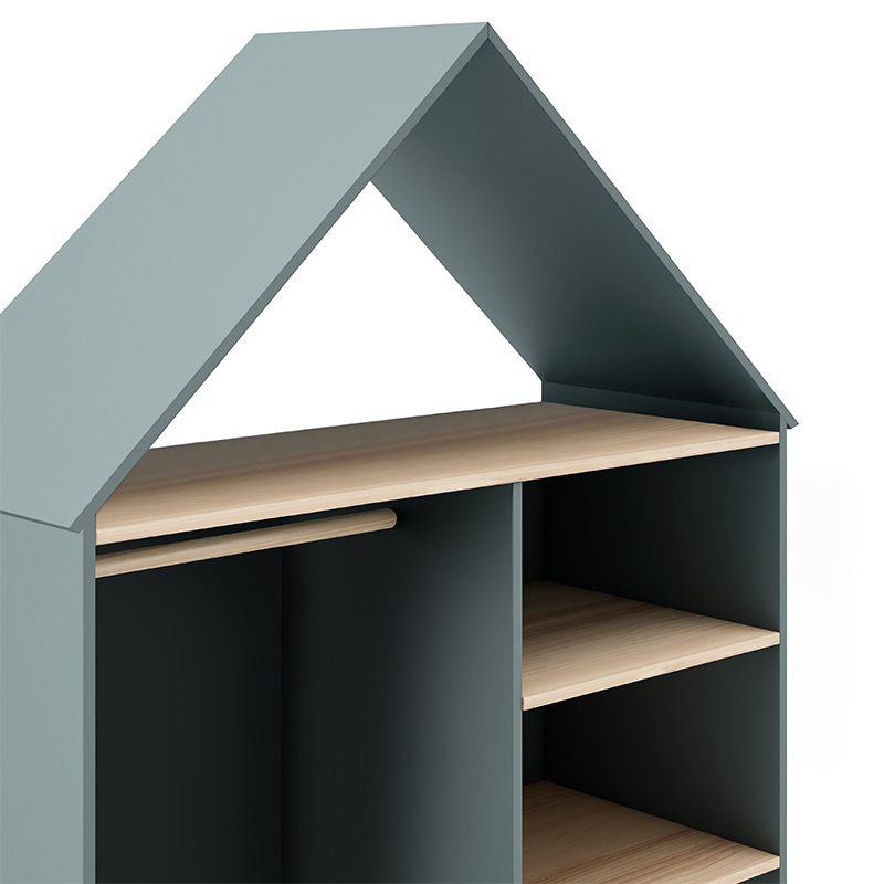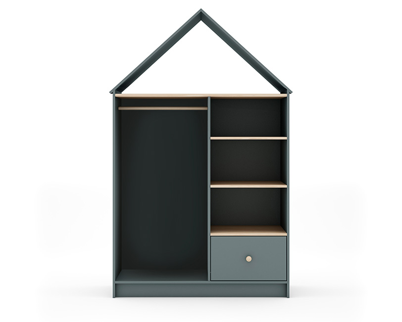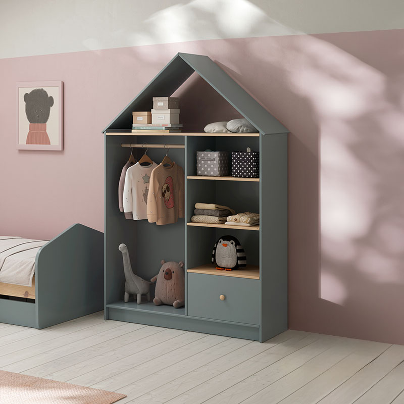 • Estrutura em formato de casa • Cor verde • Uma gaveta espaçosa • Varão para pendurar roupas • Prateleiras abertas para organização • Fácil montagem • Design versátil para diferentes idades • Puxador em madeira natural