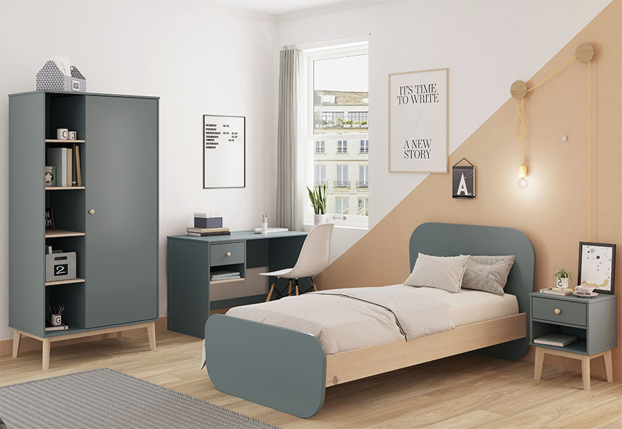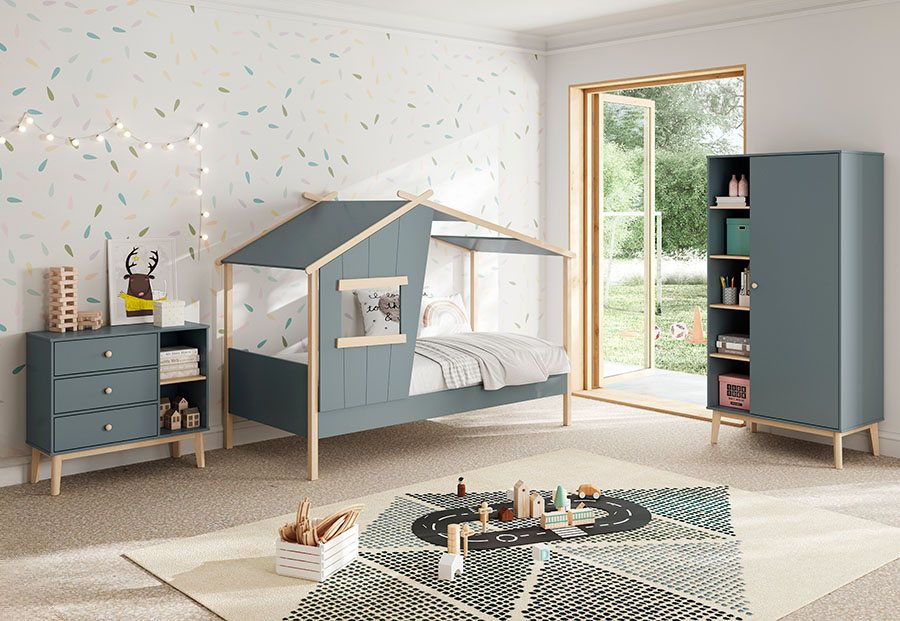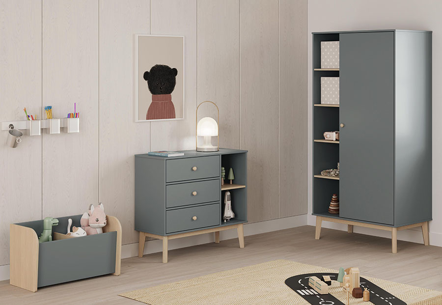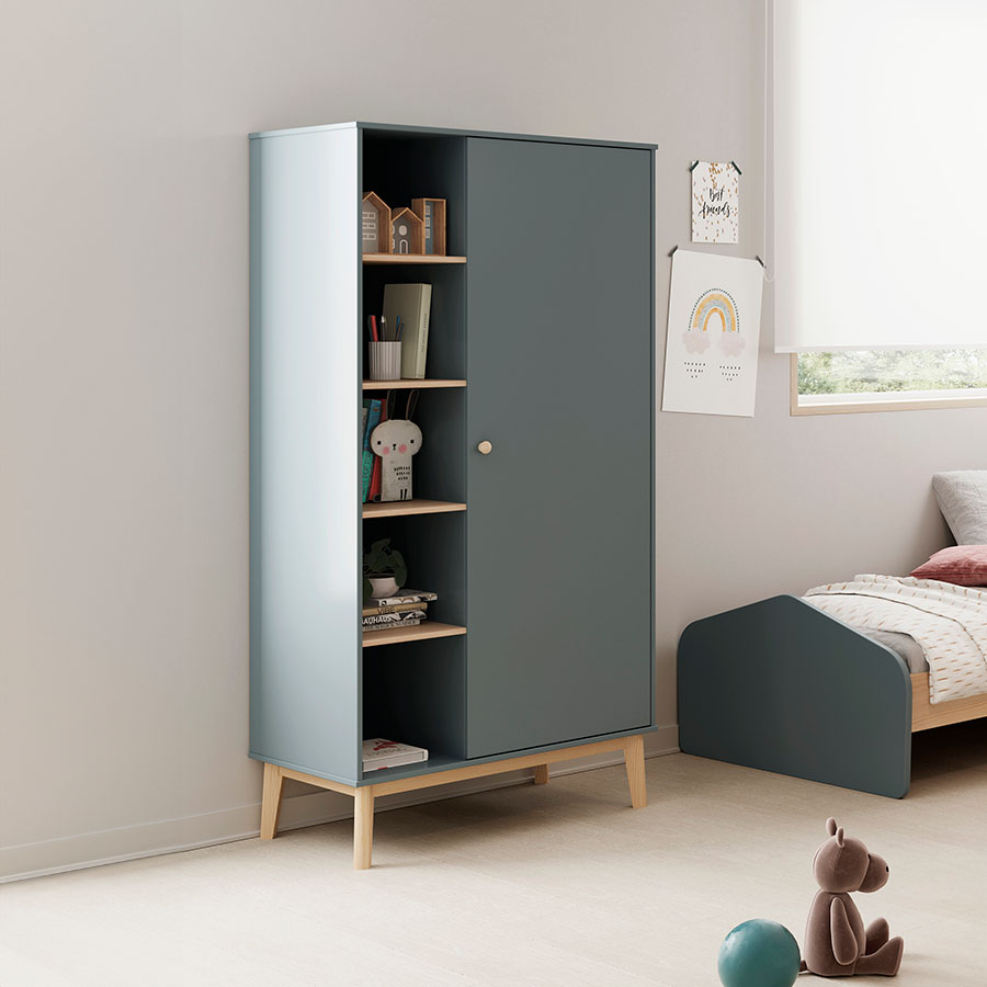 O roupeiro infantil com estante em verde e pinho é um móvel prático para organizar o quarto da criança. Combina um armário espaçoso com prateleiras abertas, oferecendo opções de arrumação.