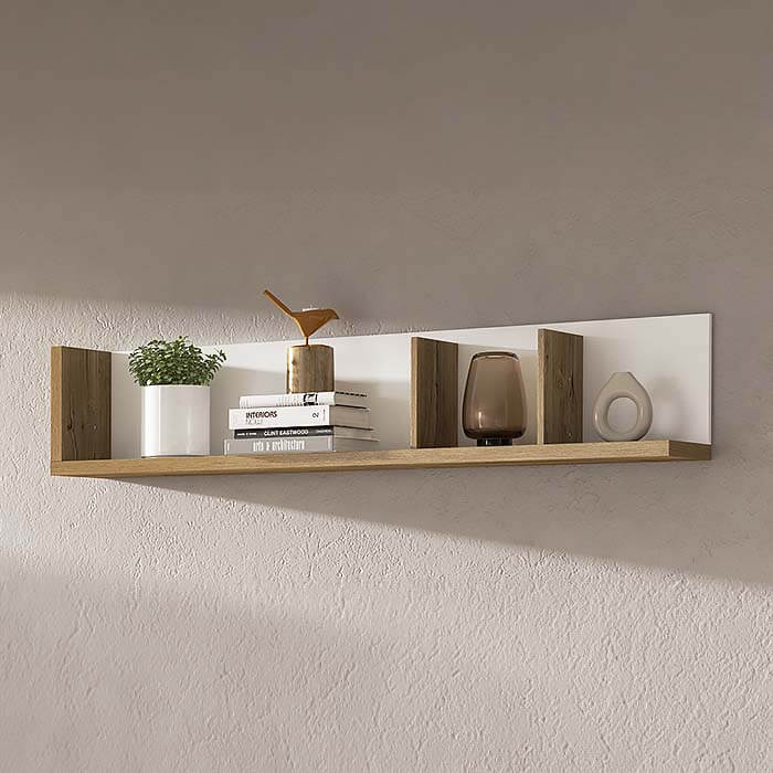 - Acabamento em Branco Brilhante e Carvalho.