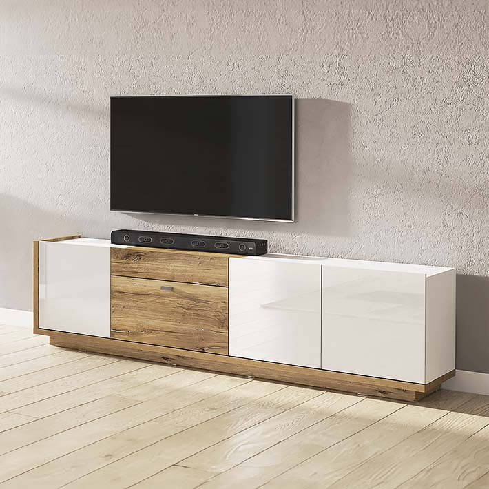 Sala de Estar completa em tons brancos e carvalho com base de TV com opção de ser suspensa. Excelente capacidade de arrumação com quatro portas, este móvel para TV torna-se o ponto focal da sala.