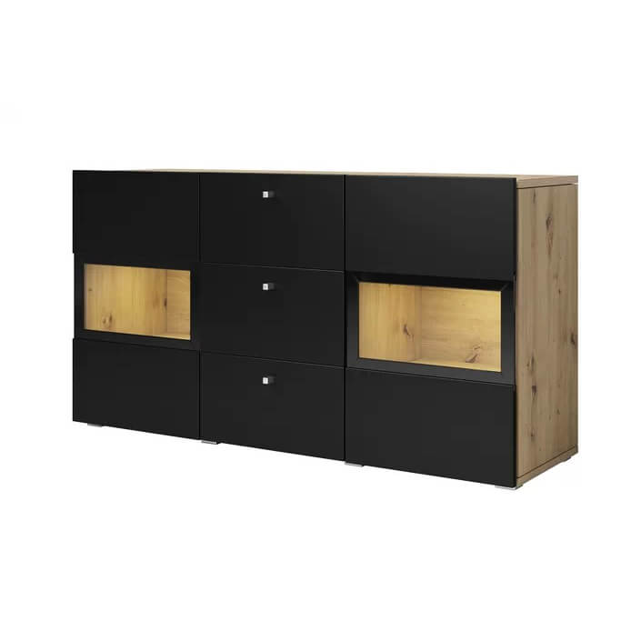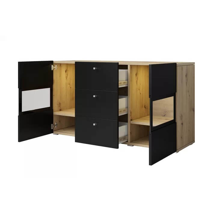 - Acabamento em Carvalho com frentes em preto fosco.