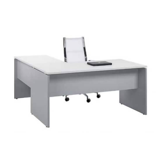 Placa de aglomerado com revestimento em melamina de 25 mm de espessura nas laterais, 19 mm na saia e rebordo em ABS. Juntamente com inserções de metal. Possui niveladores ajustáveis em acabamento preto na base. Entre o tampo e a lateral, incorpora-se uma moldura separadora com acabamento em alumínio, cada uma com 6cm de largura (que não cobre toda a lateral da mesa).