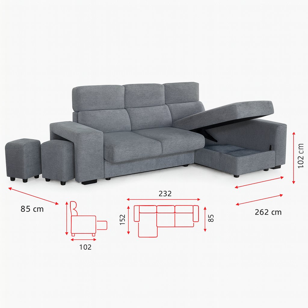 O sofá Grey é a escolha ideal para quem procura conforto e funcionalidade num só modelo. Disponível em duas medidas, com braços e chaise reversíveis, adapta-se facilmente a diferentes espaços, permitindo a montagem à esquerda ou à direita conforme a sua necessidade.