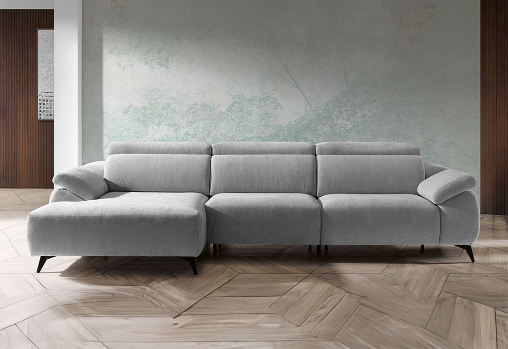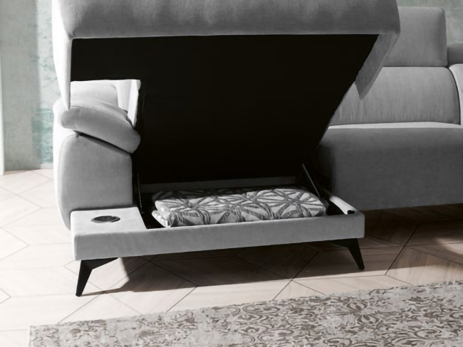 O sofá chaise longue Elba destaca-se pela sua estrutura sólida e assentos confortáveis com capacidade de armazenamento oculta.