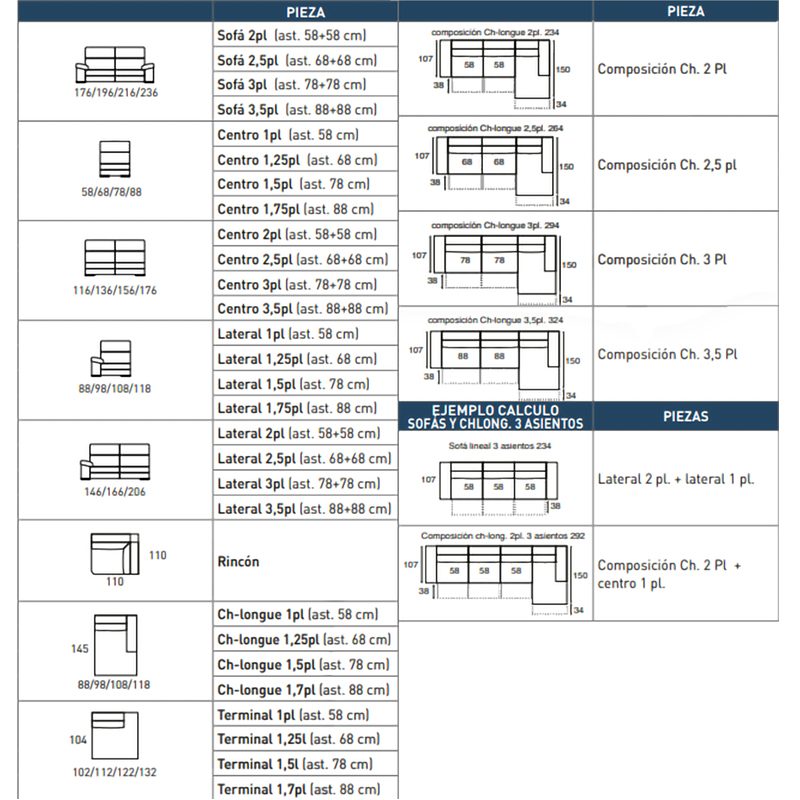 2 Assentos de 58 cm + Chaise Longue: Largura 234 cm
