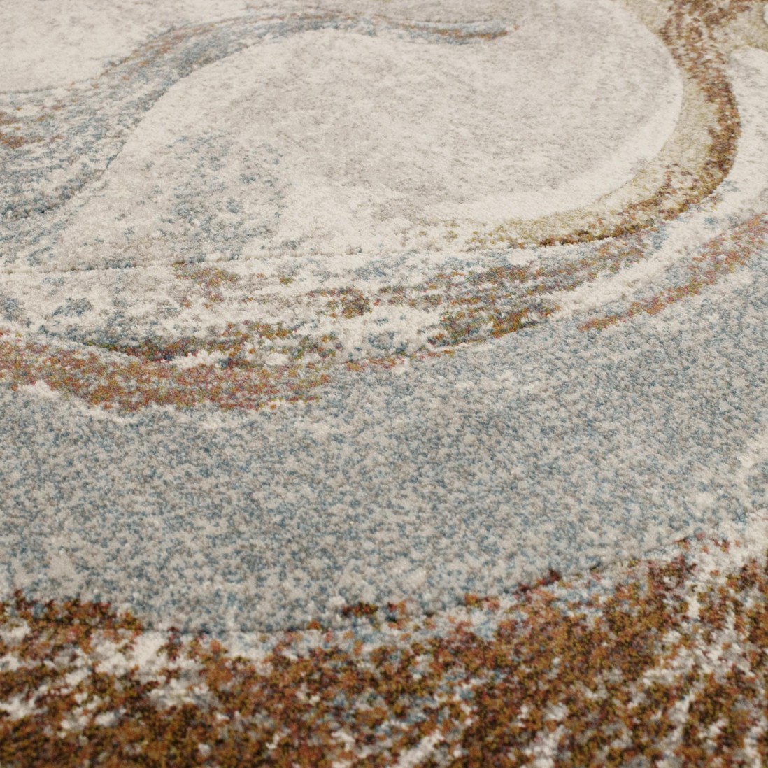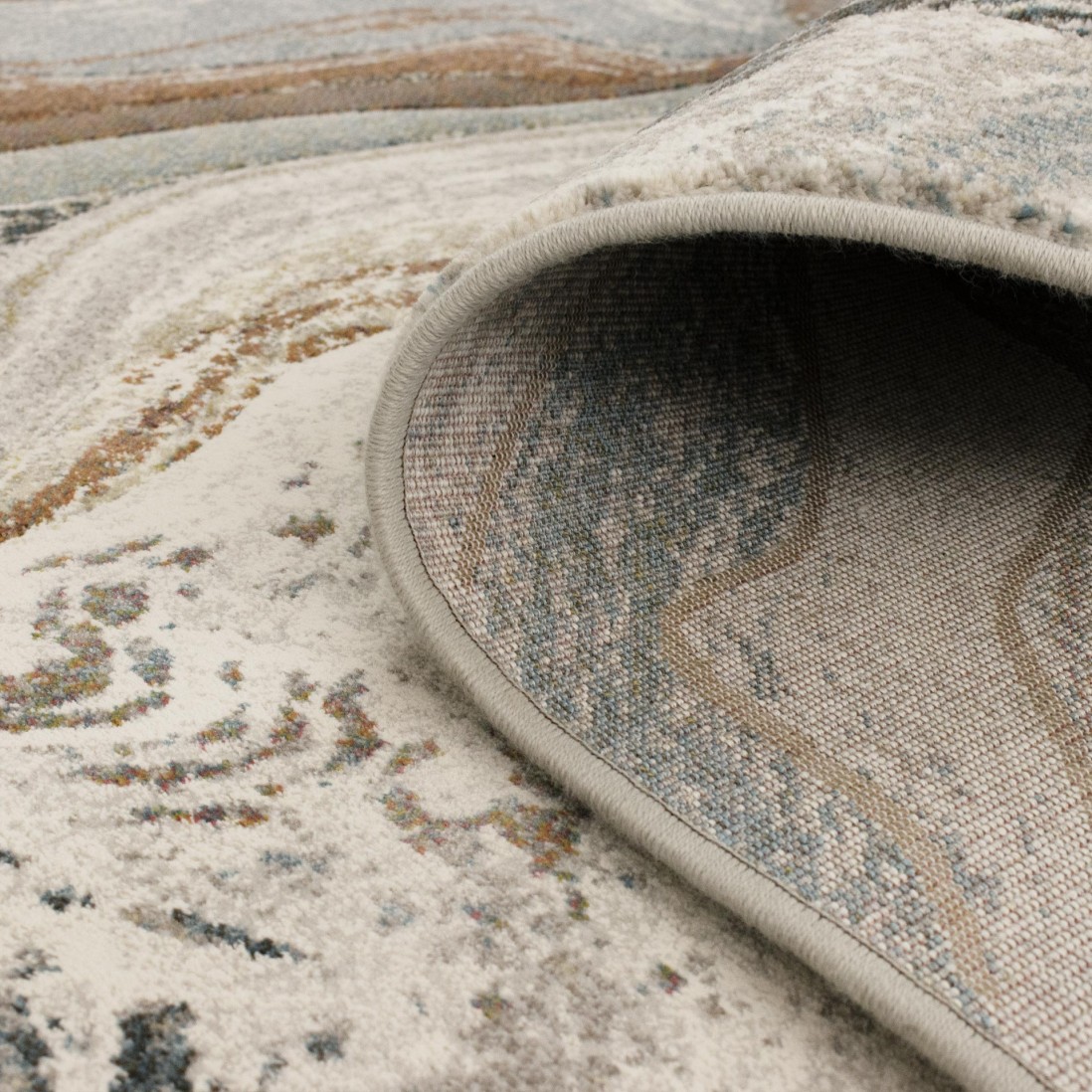 O tapete Kira destaca-se pelo padrão abstrato inspirado nas ondulações das pedras naturais. A combinação de tons suaves com apontamentos mais intensos cria profundidade visual e adapta-se facilmente a diferentes estilos de decoração.