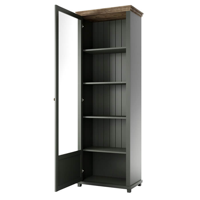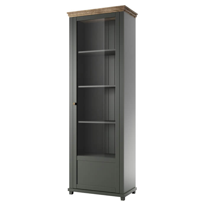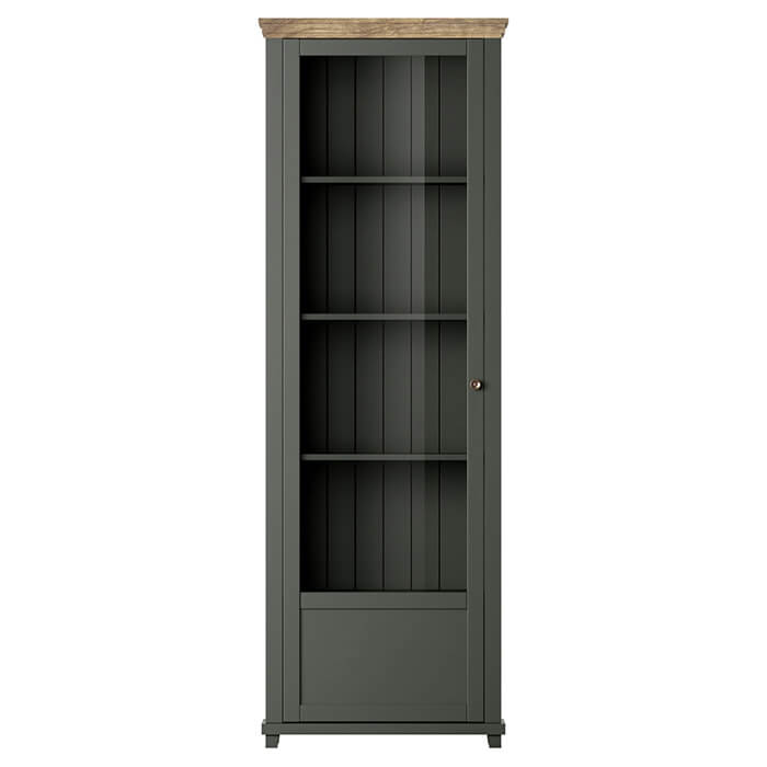 Vitrine alta clássica com uma porta e quatro prateleiras, acabamento em verde com topo em carvalho.