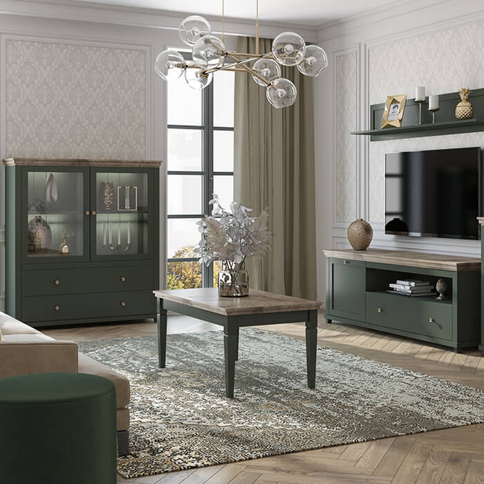 O mobiliário está disponível em verde em combinação com carvalho perfeito para composições de interiores clássicos.