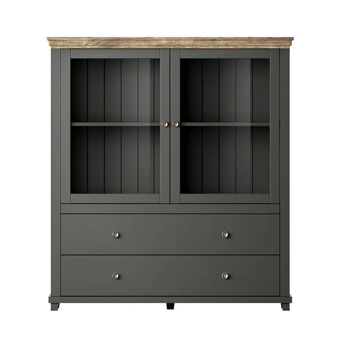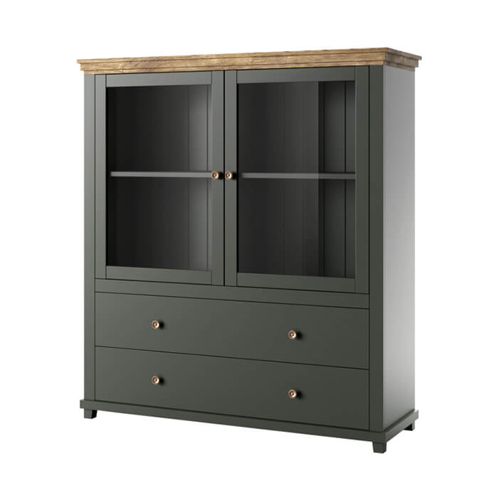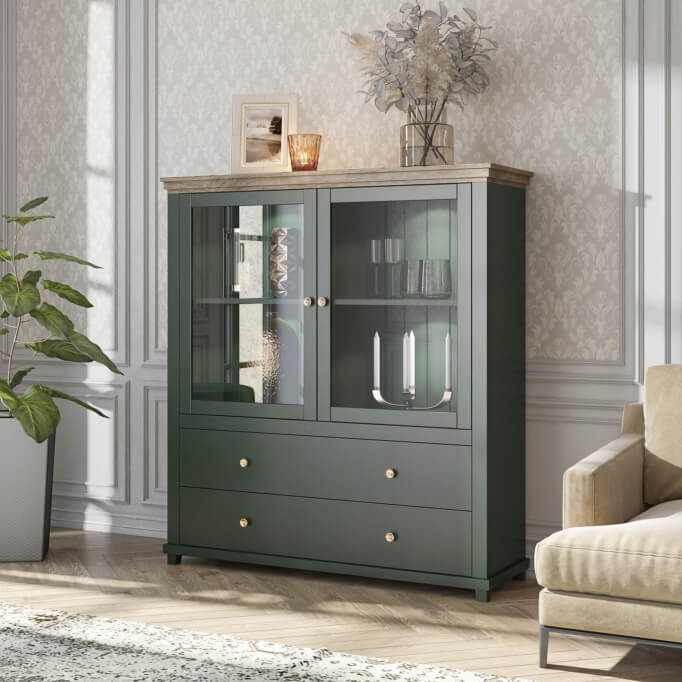 Vitrine clássica com duas portas e duas gavetas, acabamento em verde com topo em carvalho.