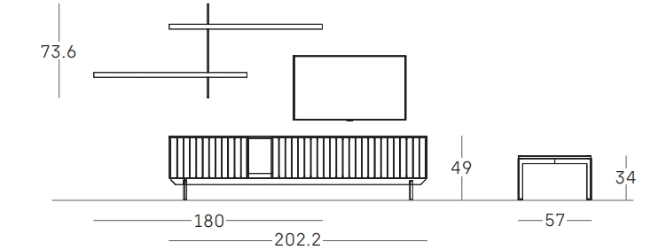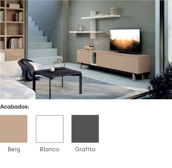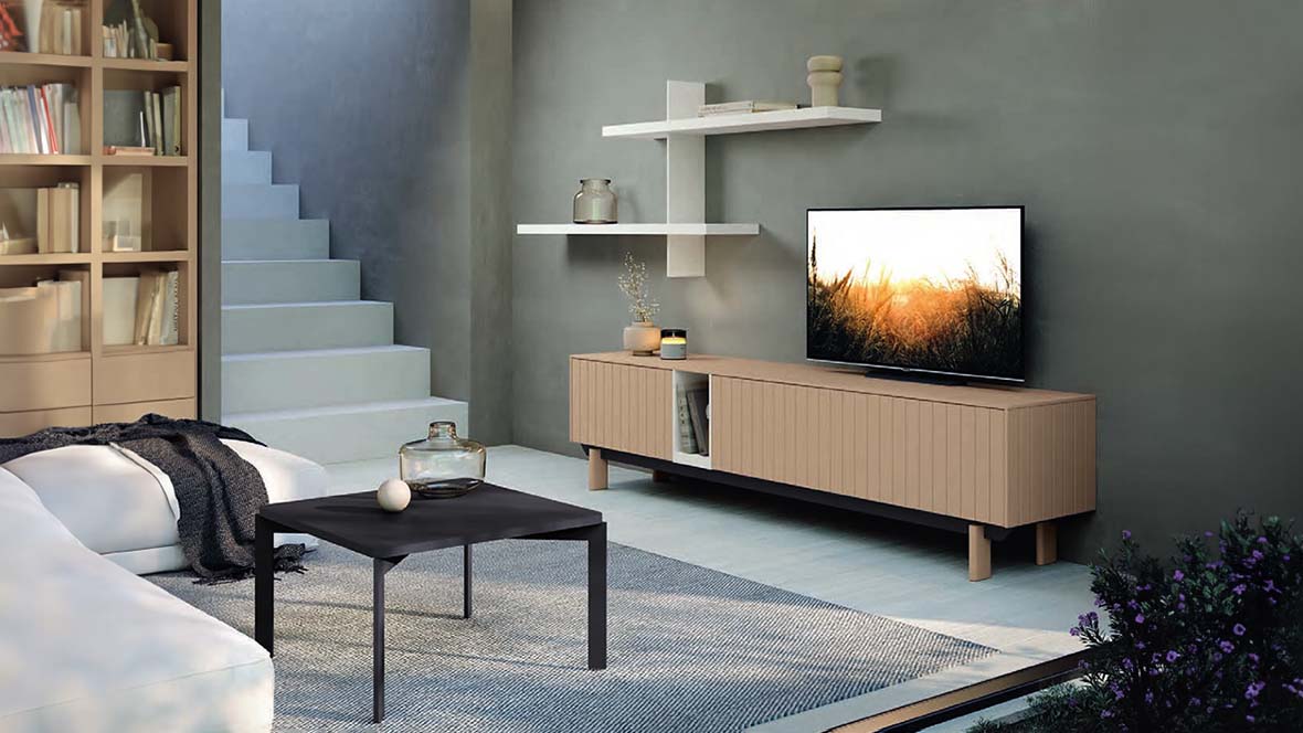 A frente canelada em madeira clara adiciona textura e interesse visual, enquanto os pés elevados proporcionam uma sensação de leveza. O nicho central oferece espaço para equipamentos multimédia, combinando funcionalidade com estética.
